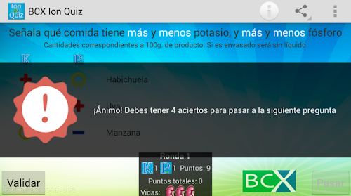 BCX Ion Quiz es una aplicación pensada para los pacientes enfermos del riñón, para que aprendan a saber distinguir qué alimentos contienen más o menos fósforo.