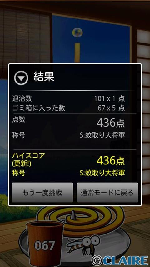 In addition to the above-mentioned normal mode, you can challenge the mini game that repulse the flitting mosquito.