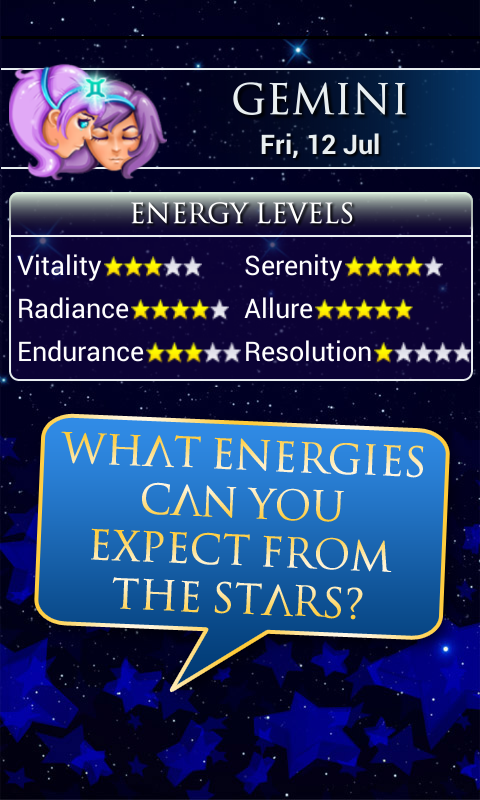✨ Energy Levels: get predictions about your Vitality, Radiance, Endurance, Serenity, Allure and Resolution every day
