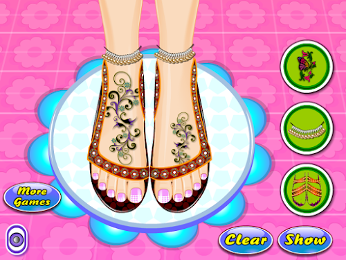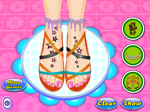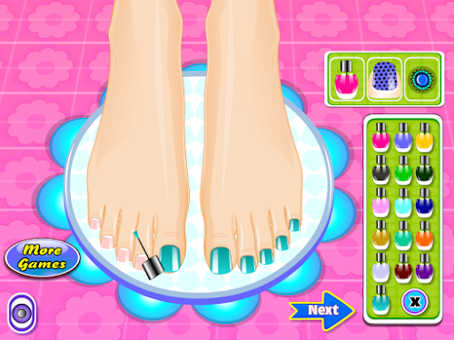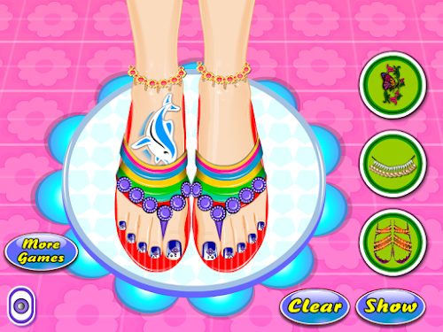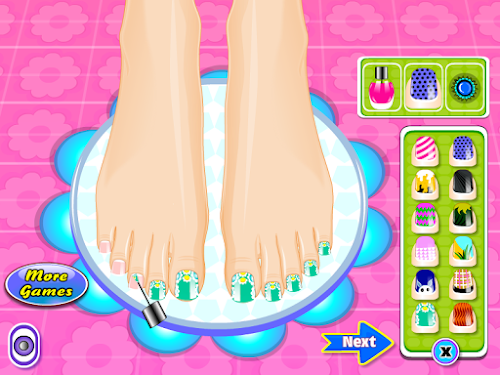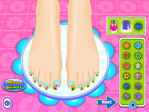 In this game have to prepare our friend pedicure because the summer approaches and the girls keep their nails so you have to look as beautiful as possible. First you must wash the feet, and dried off after them, wiping them with a dry towel. Then he has to cut nails and nail polish to make them. Punta choose to make them simple, patterned, or to put them a pebble or a form in the corner of the nail. After we finished with varnish, we must make a foot tattoo to show how beautiful, and we choose from a palette. Still need to put them a leg bracelet, and to choose a pair of sandals or slippers that fit well with nail polish and tattoo done. Thank you for choosing this game and invite you to choose and other games for girls in this category to see if you're doing as well as you did before.