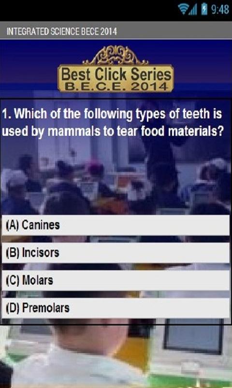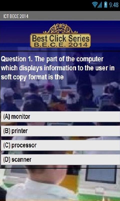 BECE candidates or students are taken through all objectives questions in the past ICT BECE 2014 in this quiz app making sure that they are able to answer each question till the end. This app accompanies Best Click Series' ICT BECE PASCO book by Umar Abubakar Siddiq Ibn
