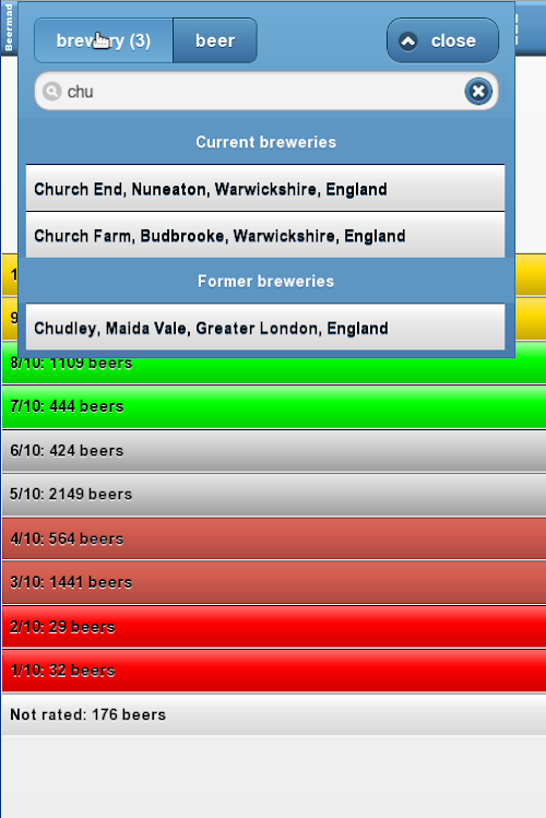 Long-press on the header bar pops up a clickable list of recently-viewed breweries.