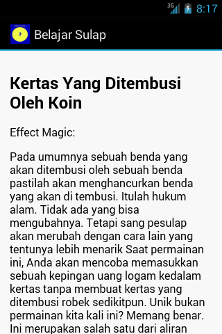 Belajar Sulap merupakan aplikasi yang menyajikan berbagai trik dalam bermain sulap. Selamat Mencoba.Learning Magic is an application that presents a variety of magic tricks in play. Good luck.