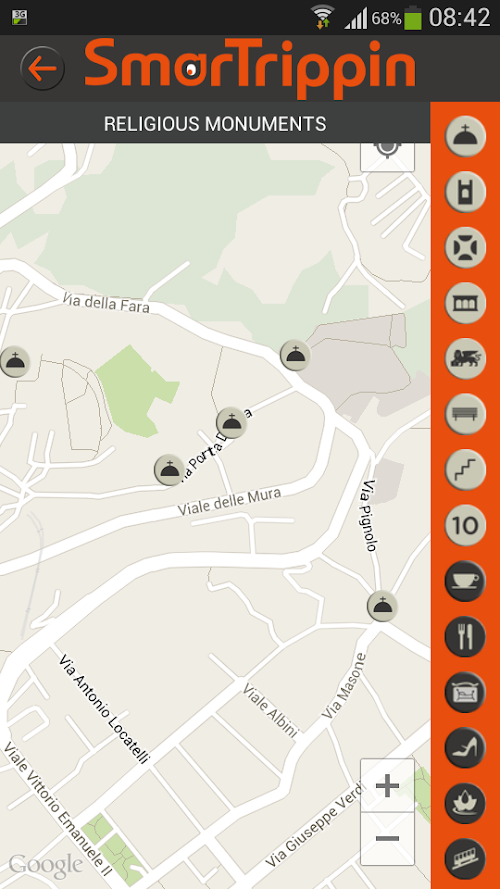 Geo-referenced audioguide: All of the content can be listened to on-location during the tour. The app brings back the tradition of the guided tour, using infinite technological reproducibility. The Italian narrator is Francesca Jemma, known for several famous advertising campaigns. The English narrator is Sharon Fryer, who has worked on many marketing campaigns for international brands.