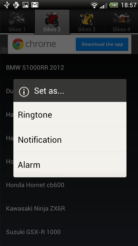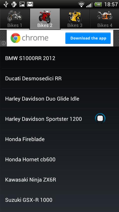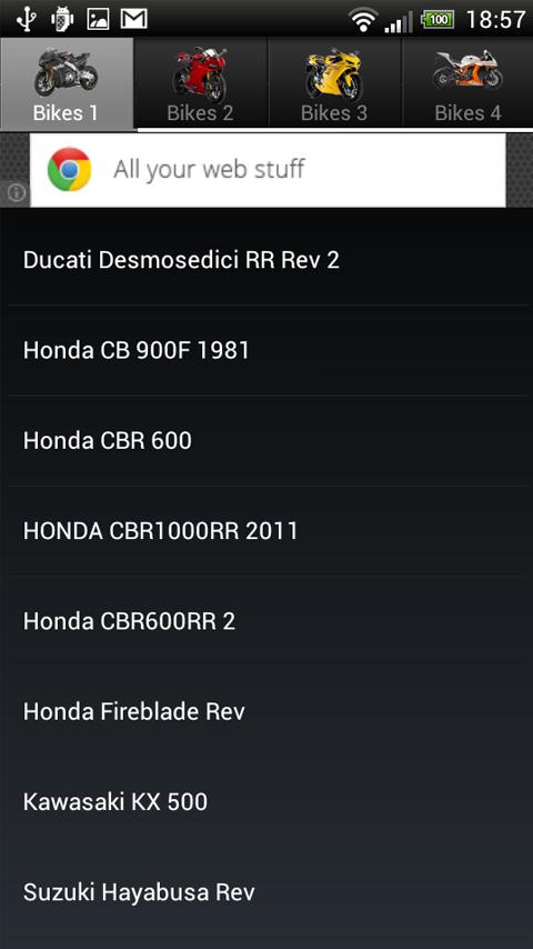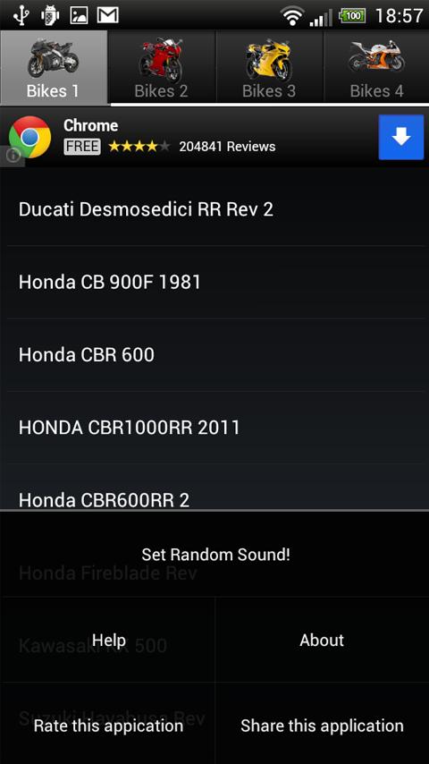 A must have for any bike fans... Do you love the sounds of bikes at full throttle or just a rumbling idle? This application lets you listen to over 20 of best bikes money can buy.
