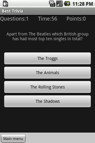 Trivia is an application that allow users to test their general knowledge about different domain of activities like Geography, Astronomy, Music, Movies, Literature, Science, Sports and many others.Users can suggest questions that will be added in game after approval operation. Play a game of trivia and get in touch with new questions. This is an educational game testing your general knowledge with trivia questions from many domains.Answer to as much as possible questions.