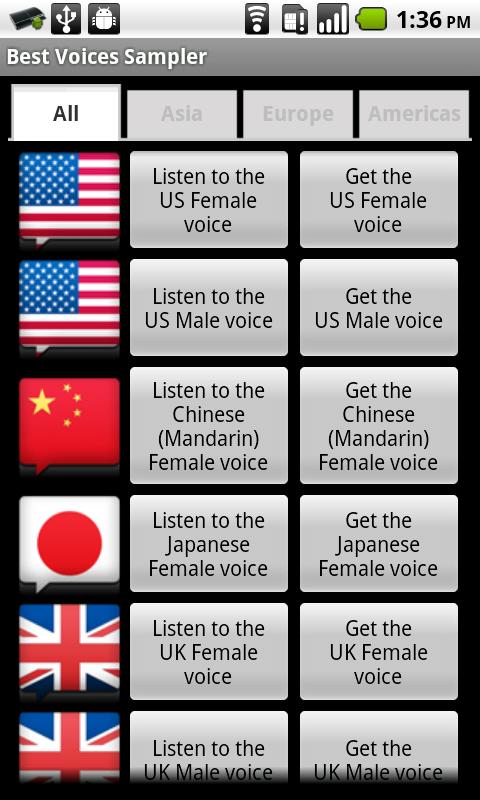 Not only does Apps4Android's "Best Voices for Android" application provide the ability to purchase the best voices on the market, it permits users to sample the voices before purchasing them! Best Voices for Android are only $2.99 each!