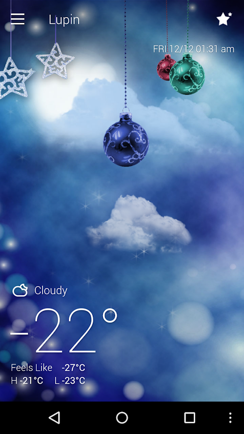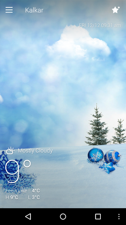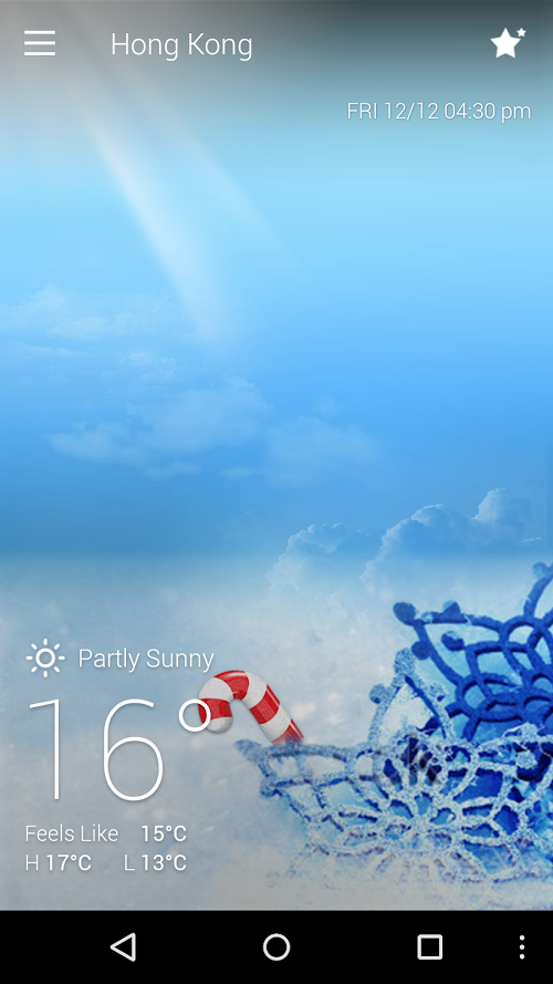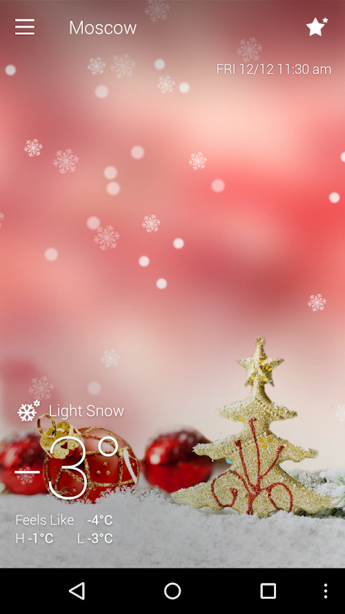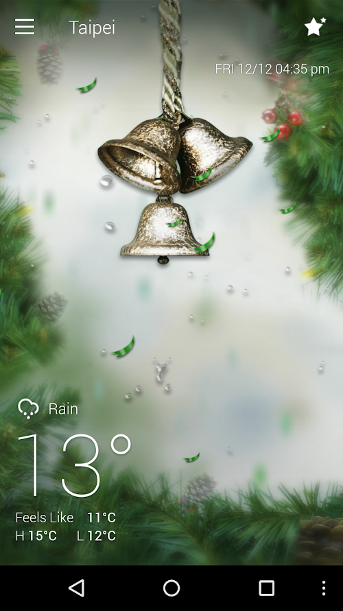 Here's a Christmas dynamic background for your weather widgets^^ It displays dynamic backgrounds for 7 weather conditions, sunny/ rainy/ snowy/ thunder/ cloudy/ overcast/ foggy, with day/ night visions. It's FREE.