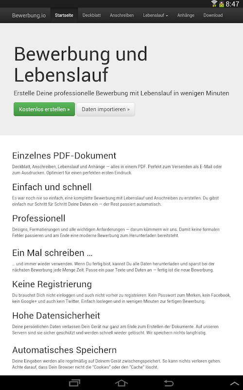 Du brauchst Dich nicht einloggen und auch nicht vorher zu registrieren. Kein Passwort zum Merken, kein Facebook, kein Google+ und auch kein Twitter. Einfach loslegen und in wenigen Minuten zur fertigen Bewerbung.