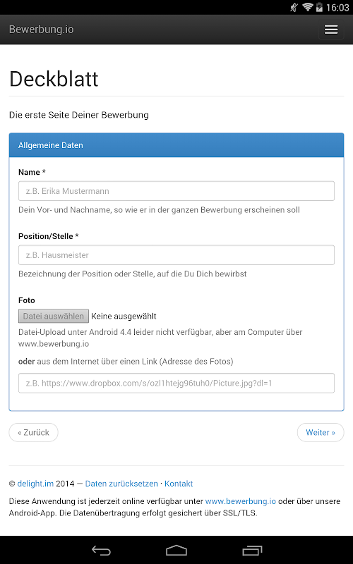 It has never been so easy to create a complete application with CV and cover letter. You simply step by step enter your data and choose your application photo from - the rest is done automatically.