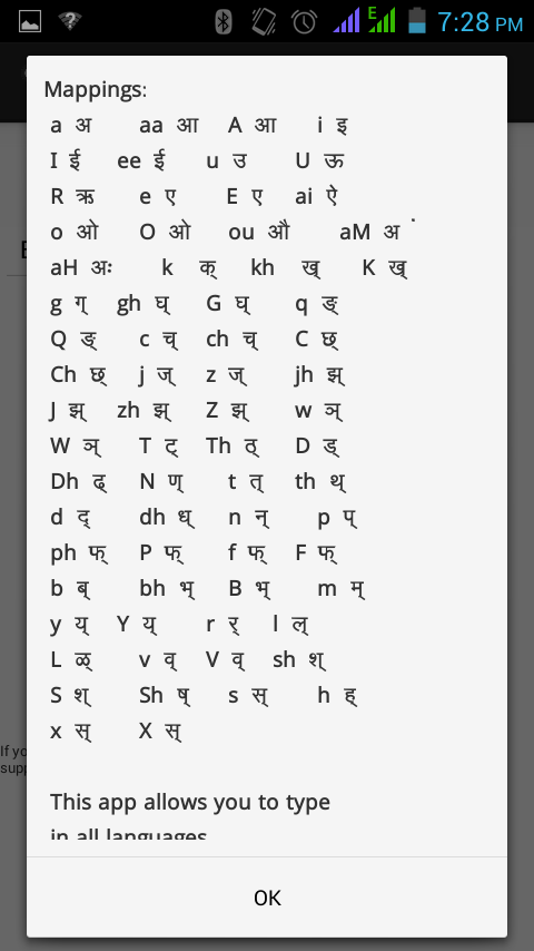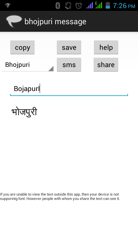 This app allows to type text in bhojpuri and other indian languages using normal keyboard.
