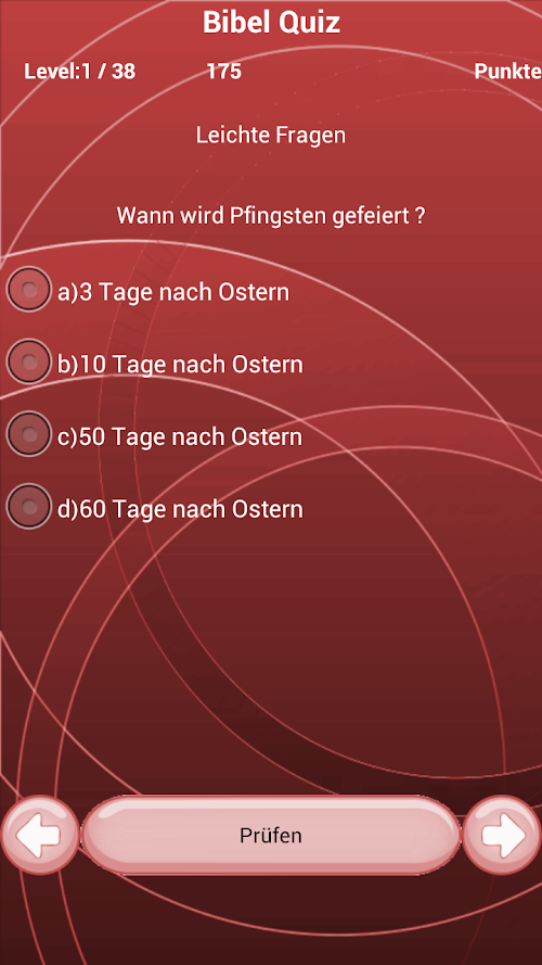 The aim of the game is to train the brain to the Bible and strength to have fun. Answer the questions correctly, you get to the next level.