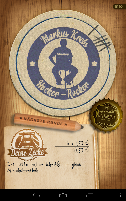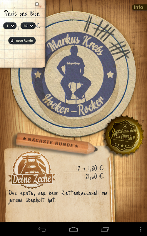 Mit der ultimativen Markus Krebs Bierdeckel App macht jeder Kneipenbesuch noch mehr Spaß! Mit dieser App kannst du deine Getränke ganz einfach mitzählen und das Beste, du hast auch noch Spaß dabei! Denn als besonderes Feature bekommst du pro gezähltem Getränk einen von seinen Super-Knaller-Sprüchen sowohl als Audio- und als Textausgabe. Mach einfach für jeden Drink einen Strich, indem du auf den Bierdeckel tippst. Tippst du auf den Kronkorken "Deckel machen", kannst du im sich öffnenden Menü den Bierpreis eingeben und die Rechnung erscheint fortlaufend auf dem Kellnerblock. Also nie wieder die Frage, wie viele Bier hatte ich?!