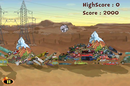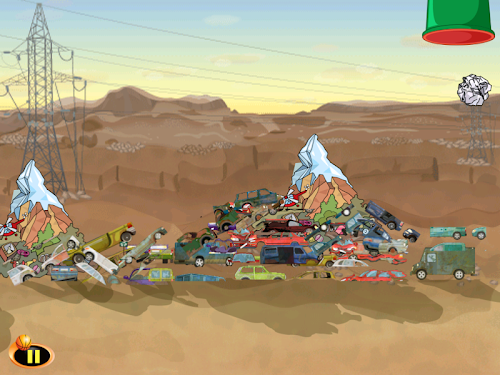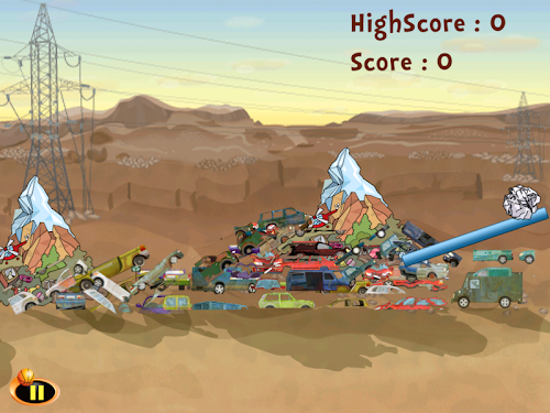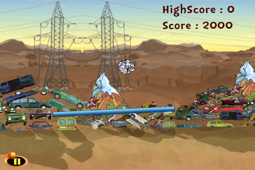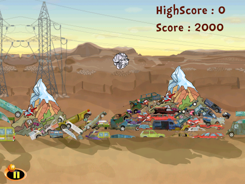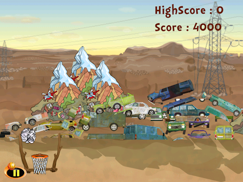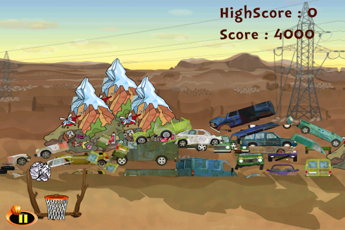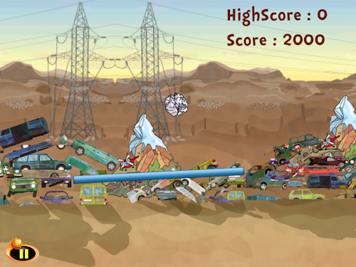 So let's look at the game play and see how it is played. First the paper trash ball drops from the shute on the right of your screen in this sims basketball game. Your task is then to carefully bounce the ball across the junk yard to the paper trash can without it touching the ground. To do this you have to draw rubber bands with your finger for the paper trash ball to bounce off. You need to be quick or the ball will touch the ground and you will lose.
