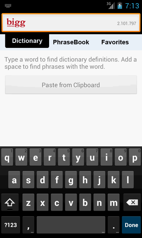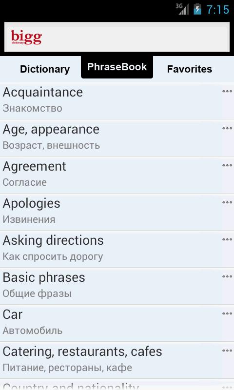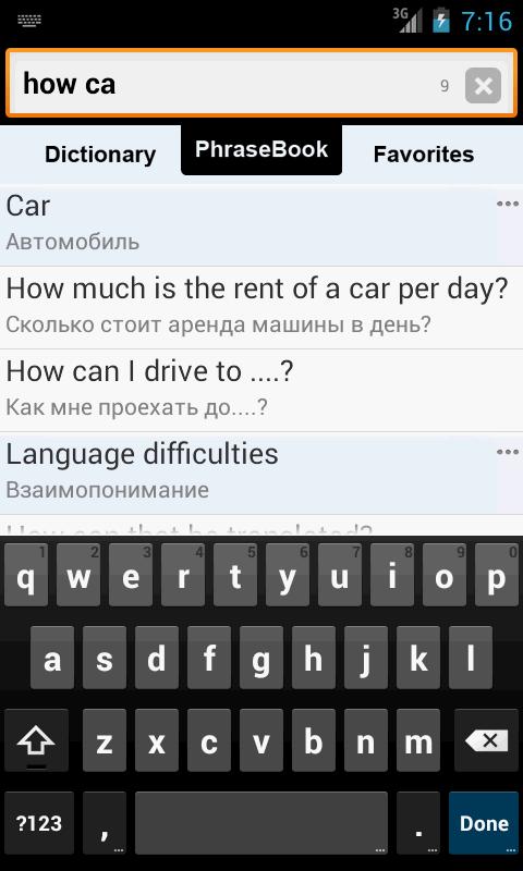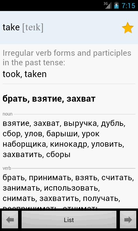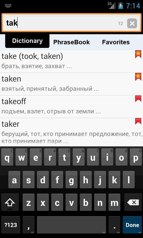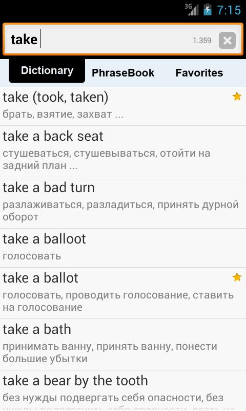Big English-Russian and Russian-English Offline Dictionary with PhraseBook. More than 3.200.000 words and phrases in the Dictionary and about 2000 phrases in the PhraseBook. Doesn't need an internet connection!