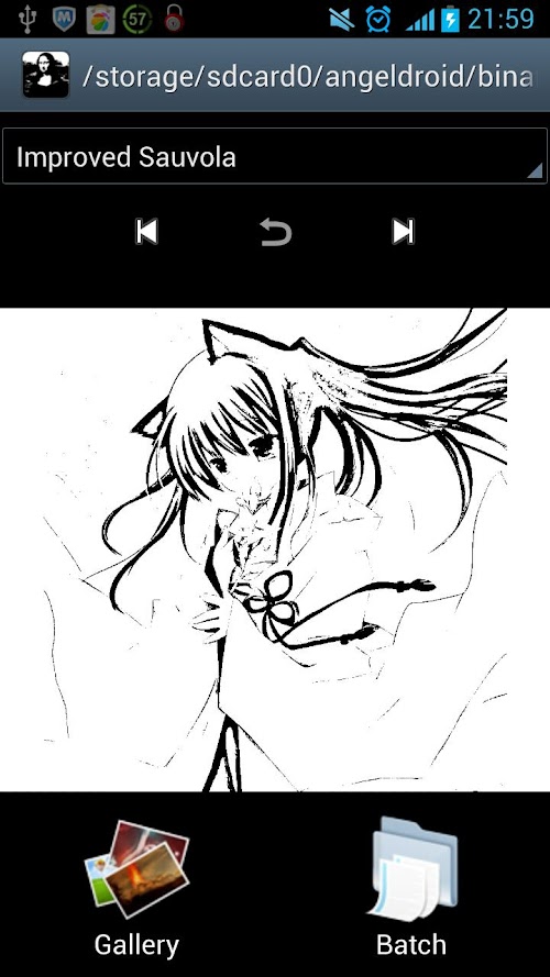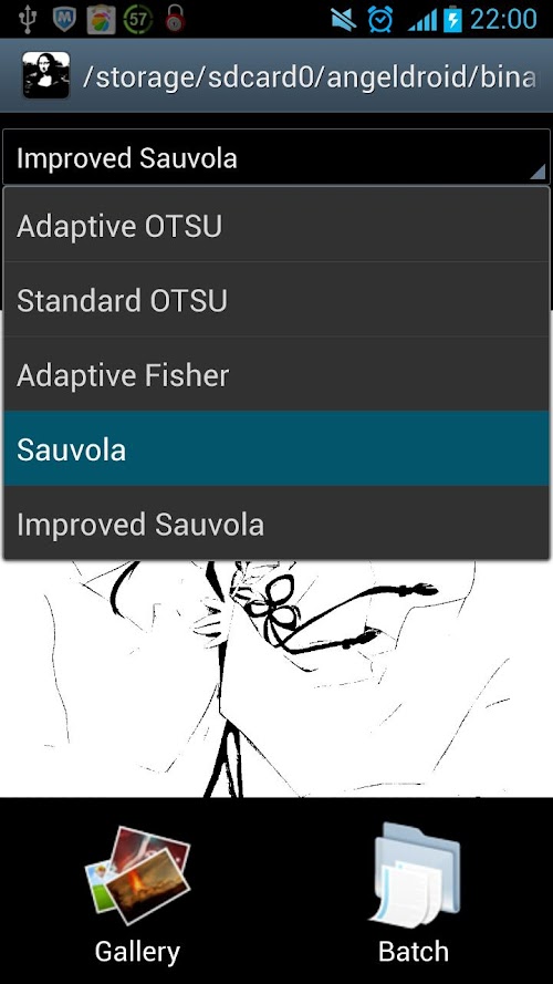 You can pick a picture from gallery, and then crop it, the picture will be binarized by selected mode (algorithm). Also support batch process, just select a folder of your phone, then all pictures (jpg or bmp format) will be binarized one by one. Binarization results will be saved into SDCARD, the result folder name is displayed in app title.
