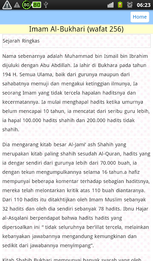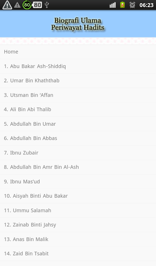 Aplikasi ini berisi biografi para ulama periwayat hadits shahih mulai dari zaman Khulafaur Rasyidin, Istri Rasulullah, Tabi'in, hingga ulama masa kini.