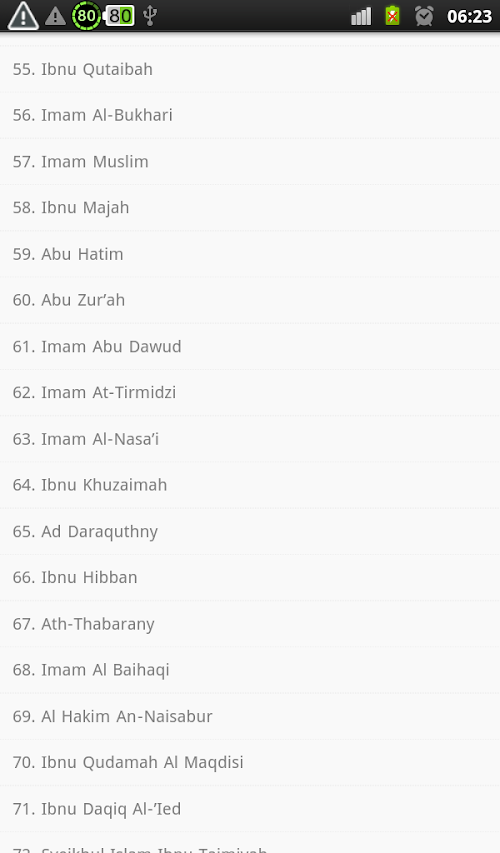Total ada 77 biografi ulama yang dapat ditemukan di aplikasi ini, termasuk di dalamnya Aisyah bin Abu Bakar, Imam Bukhari, Imam Muslim, Abu Dawud, Imam Syafii, Imam Ahmad bin Hambal, Imam Abu Hanifah, Nasa'i, dsb.
