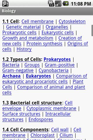 Cell: Cell membrane | Cytoskeleton | Genetic material | Organelles | Prokaryotic cells | Eukaryotic cells | Growth and metabolism | Creation of new cells | Protein synthesis | Origins of cells | History