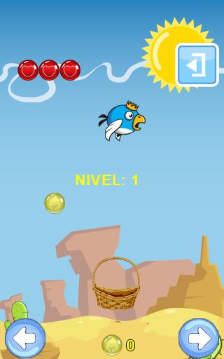 In this simple game, the player has to move a cart with the onscreen buttons (left and right) and pick up the green chips pulling the bird, but not the cards "skull" which also shoots because these take away a life.