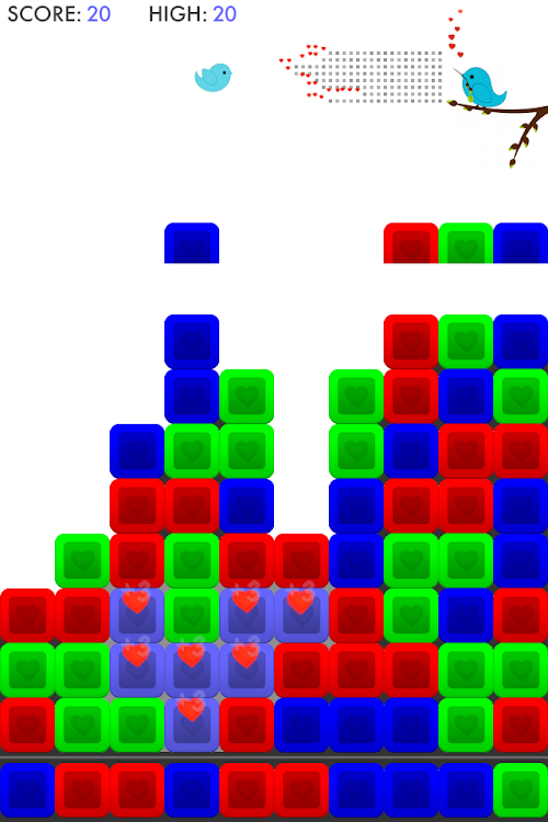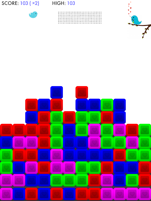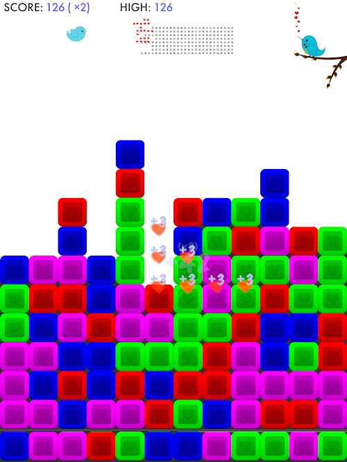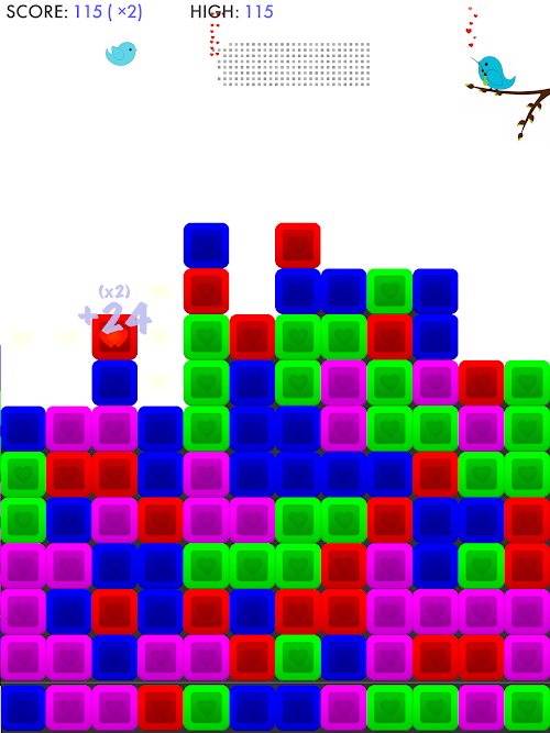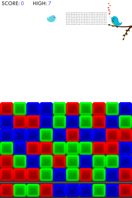 To play, just pop matching colors. Try to pop larger blocks, and make sure the distance between the two birds doesn't increase too much. Too much distance and they'll just fly away.