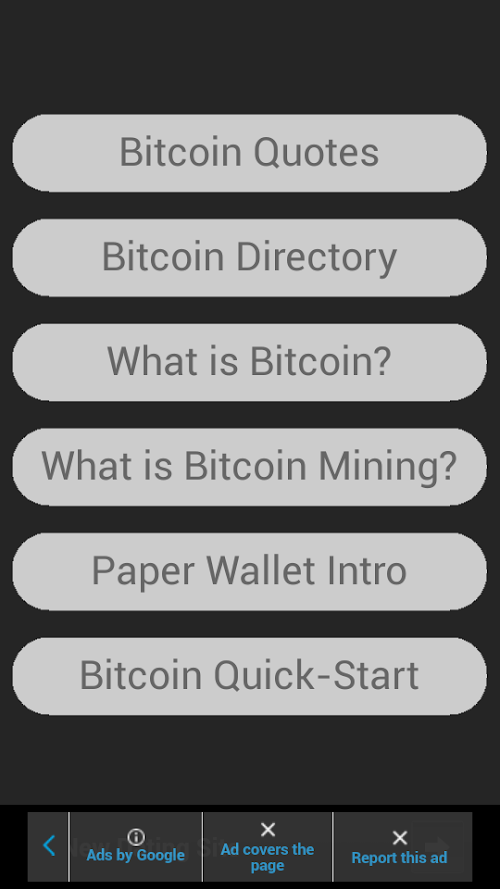 For beginners this app answers some basic questions such as: What is a Bitcoin, how to get started, mining basics and creating a paper wallet.