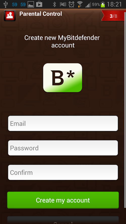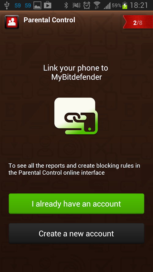 The Bitdefender Parental Control needs to be installed on your child’s mobile phone. To use Bitdefender Parental Control, you must link your device to a MyBitdefender account by logging in to the account from the app. If you don’t have an account, choose to create a new account using the corresponding button.