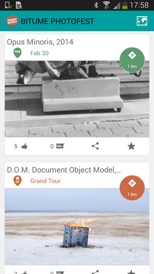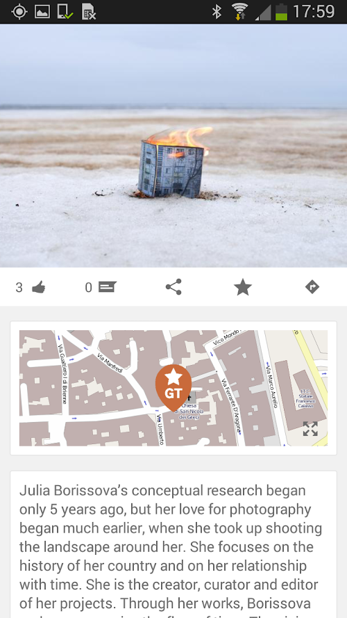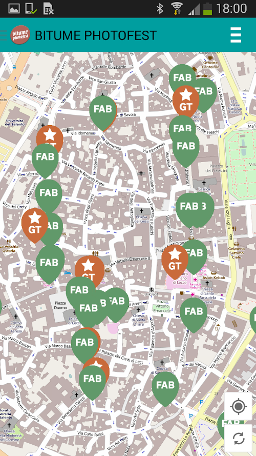 Infine, gli utenti che vorranno registrarsi avranno a disposizione un set di strumenti social (commenti, “like”, condivisioni) per esprimere le loro opinioni o raccomandare le esposizioni che hanno apprezzato maggiormente.For technology lovers, the festival Bitumen provides a convenient multimedia guide: anyone with a smartphone with Android operating system will in fact visit the exhibitions around the historic center of Lecce using the application "Bitumen Photofest", a free download from Google Play Store.