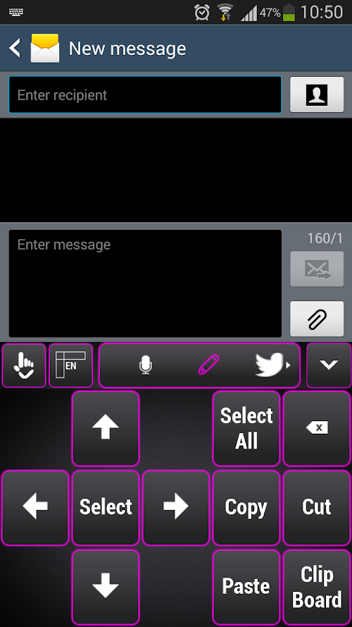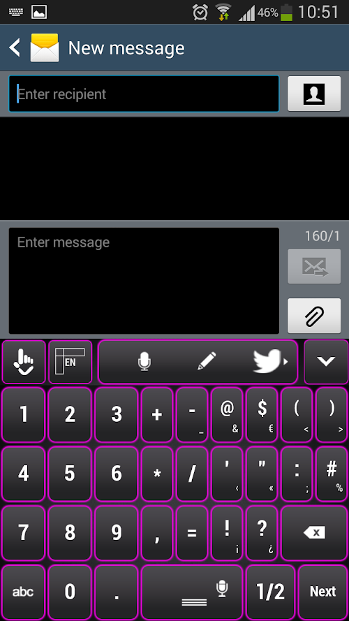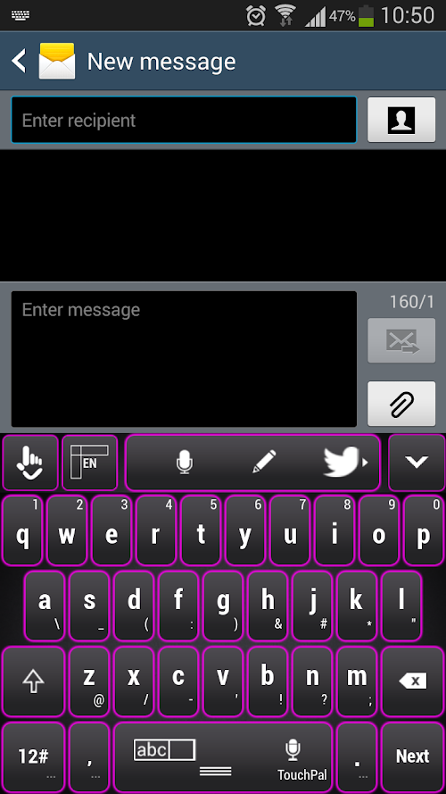 This keyboard is all what you need.Your conversations will be much funnier and easier with this new keyboard theme for your favorite gadgets. This dark grey brings elegance to your keyboard and will definitely make you feel self confident. Tired of all these colored girly themes? Accessorize your smartphone with a touch of elegance with this Black and Purple keyboard theme!