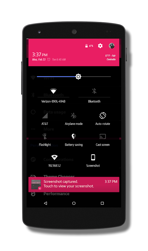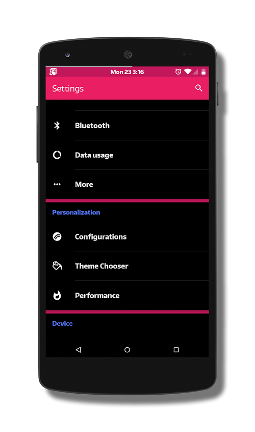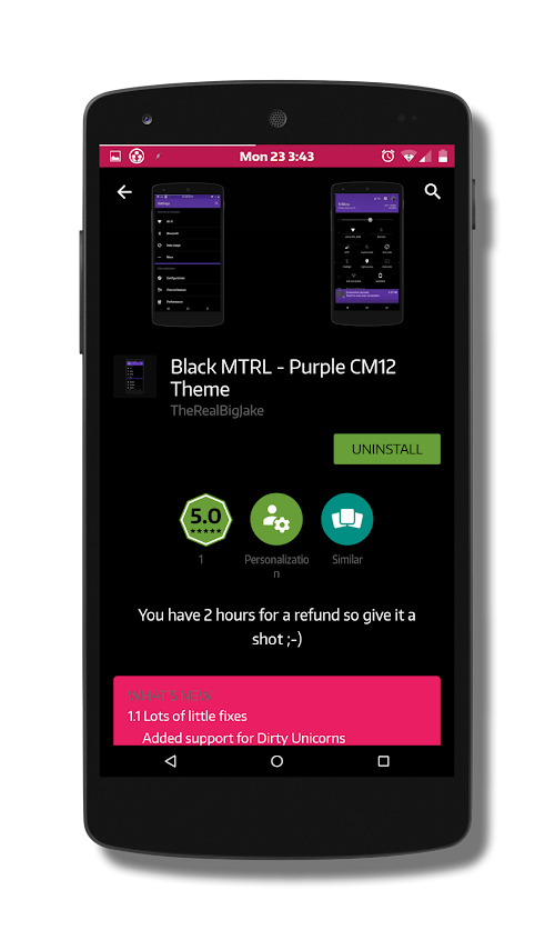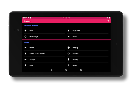 Black MTRL - Pink is a Blacked Out Material colored theme for the new CM12 theme chooser and tested on AICP, BlissPop, Euphoria-OS, Dirty Unicorns and Resurrection Remix for the Nexus 5 and Nexus 7 (2013).