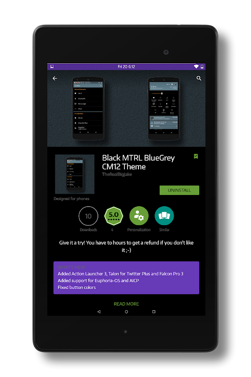 Black MTRL - Purple is a Blacked Out Material colored theme for the new CM12 theme chooser and tested on AICP, BlissPop, Euphoria-OS and Resurrection Remix for the Nexus 5 and Nexus 7 (2013).