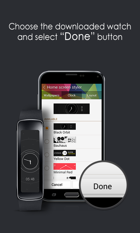 - Select the clock to display on the home screen of your Gear Fit device.