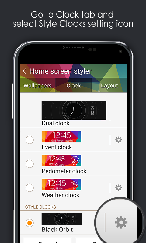 - You can find the downloaded clock app at Gear Fit Manager application (Home Screen Styler → Clock tab → Style Clocks setting menu).