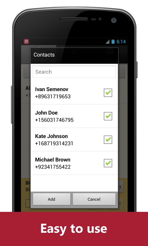Blacklist Plus is an easy to use call blocker. You can add to the blacklist not only any contact or number from the calls and messages logs, but also the whole range of any phone numbers that begin with certain digits. Any numbers in any format, can be added to both the black and the white lists.