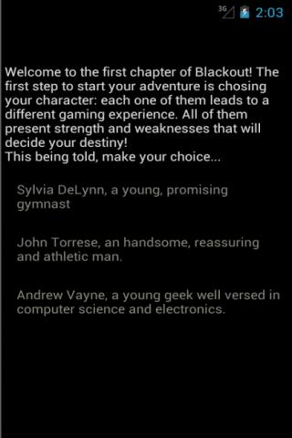 The first chapter of an engaging adventure, Blackout puts you in front of several plot branches. You're up to discover all the possible endings, but keep in mind that only one is the "perfect" finale and that you might also find something unexpected..