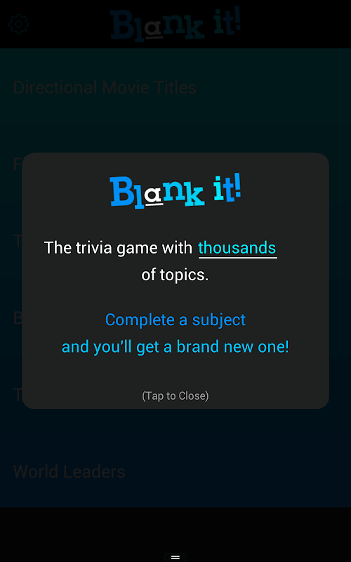 There are plenty of topics to choose from, just complete a set and a new one appears. If you are looking for your next addiction, give Blank It! a try. It's the greatest thing since _______.