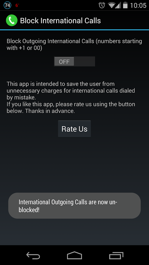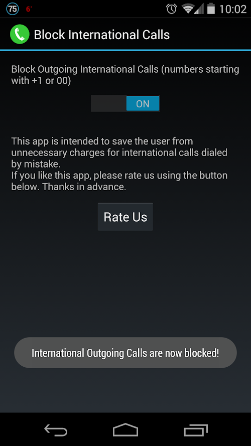 A simple and light application to block all outgoing international calls. This prevents users from dialling international numbers (that start with + or 00) by mistake. When you want to make international calls, simple turn off outgoing international call blocking with one button.