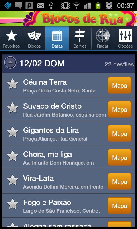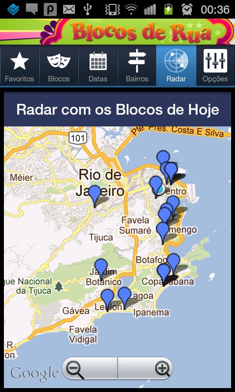 There are 540 Carnaval Street parties going to happen in Rio de Janeiro, on this 2012 edition. You can know where and when there's a party going on, how to get there and be notified on the day of their parade. Open the Radar and know about near parties with your GPS. It has never been so easy to find where to party during Carnaval in Rio!