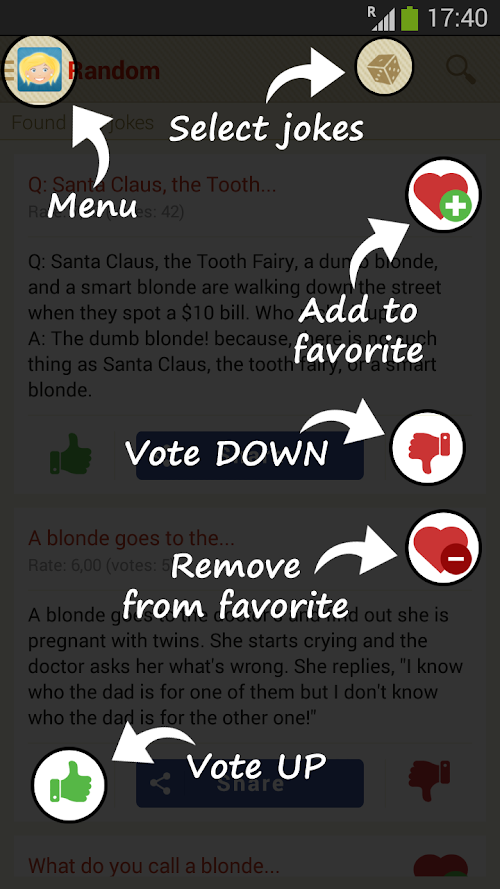 - to add a joke to your favorites, click the "heart-plus”, and to remove a blonde joke from your favorites, click the "heart-minus";