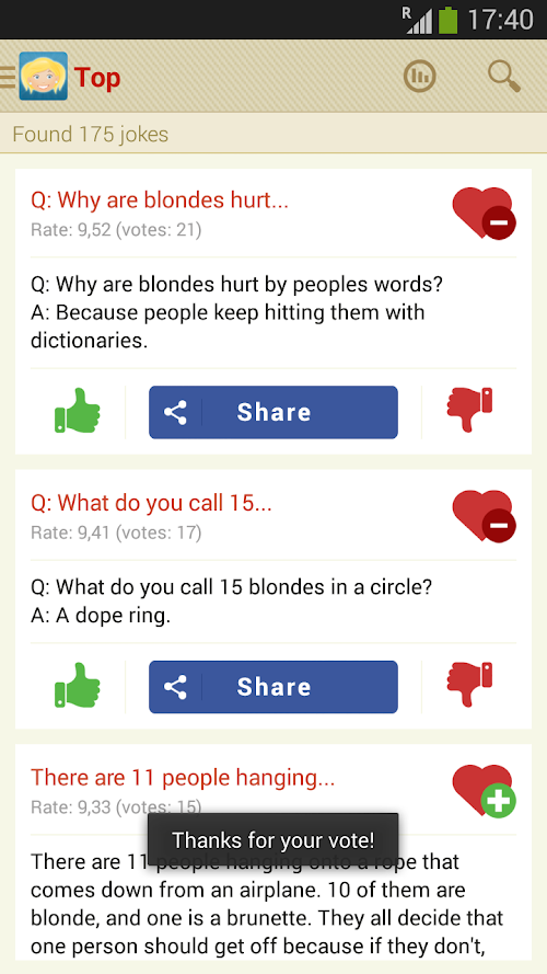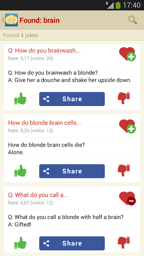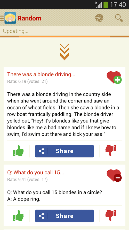 You can browse the jokes in a number of different ways: new, best, random, favorite. In the category of the best; jokes are sorted in respect to users review. You can also can affect the position of the jokes, in the ranking, giving them "a plus" or "a minus". Ratings too, are updated every three days. You can also create your own list of favorite blonde jokes, you just have to click on the "heart-plus" icon to add a joke, or a "heart-minus" icon to remove a joke from your favorites.