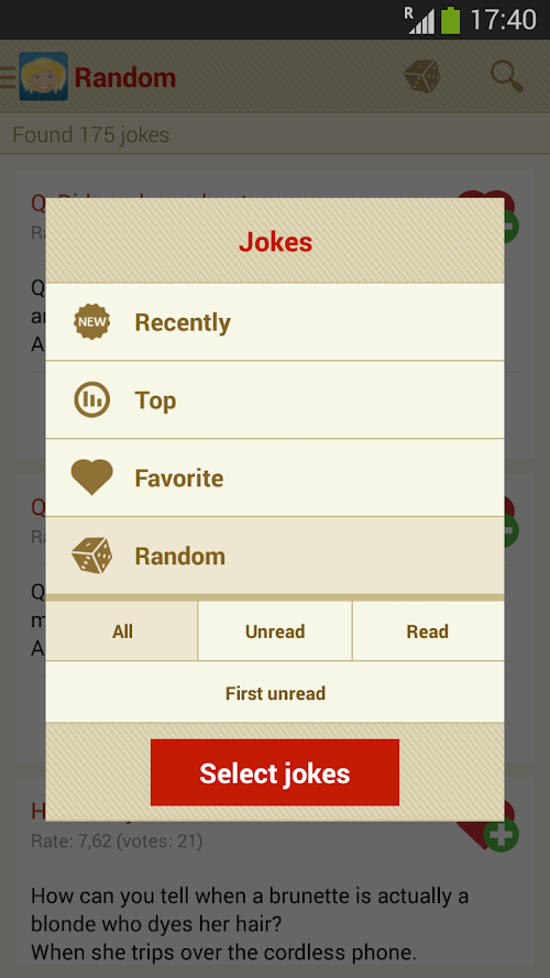 - selecting: all, unread or read; you specify which jokes you want to view;