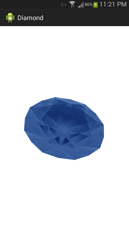 The app shows an OpenGL 3D toy model of a diamond. The user has limited control over some parameters of the diamond cut and index of refraction of light.