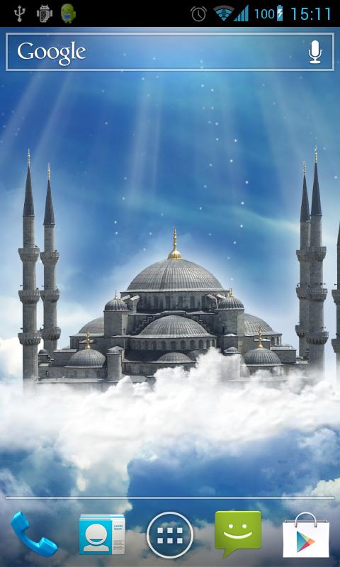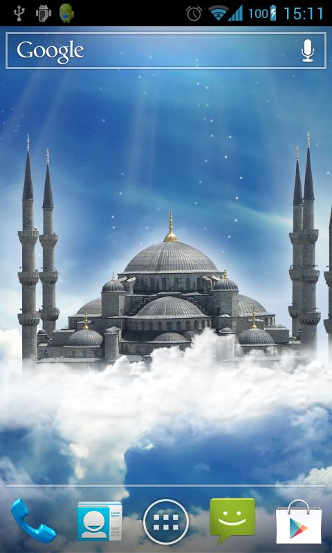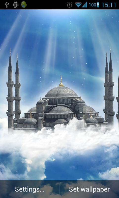This Blue Mosque Live Wallpaper is a free app with the image of Sultan Ahmed Mosque floating on a cloud illuminated by the light from the Sun.
