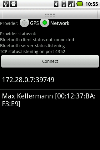BlueNMEA is an Android application which sends location data over Bluetooth (RFCOMM) or TCP in the NMEA format.