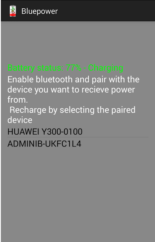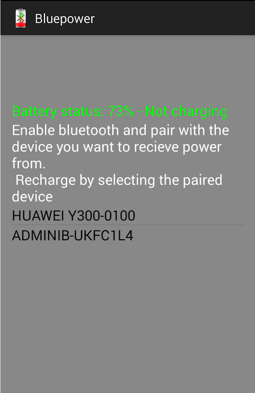 BluePower uses Bluetooth technology to let you recharge your device by sharing the power of one of your other Android devices or ask a friend to share 10% of his phones battery. Simply enable Bluetooth and pair the two devices. Select the one with enough energy and let BluePower do the rest.