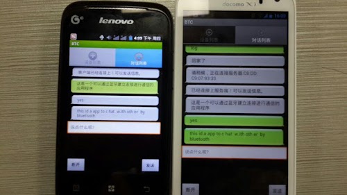 The application can communication between two android phones. One as the server and the other as the client.When they connected by bluetooth,they can seed data to the other one.It can be used in special environment absence of cell phone and WiFi,such as the conference room of is neither cell phone signal nor WiFi signal.It can be used at the field of Internet of things if have a little improvement,especially it is very widely used in the smart home system.