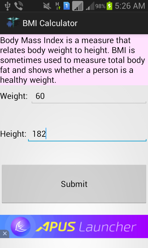 This version of BMI Calculator Android App comes with one universal variant which will work on all the Android devices.