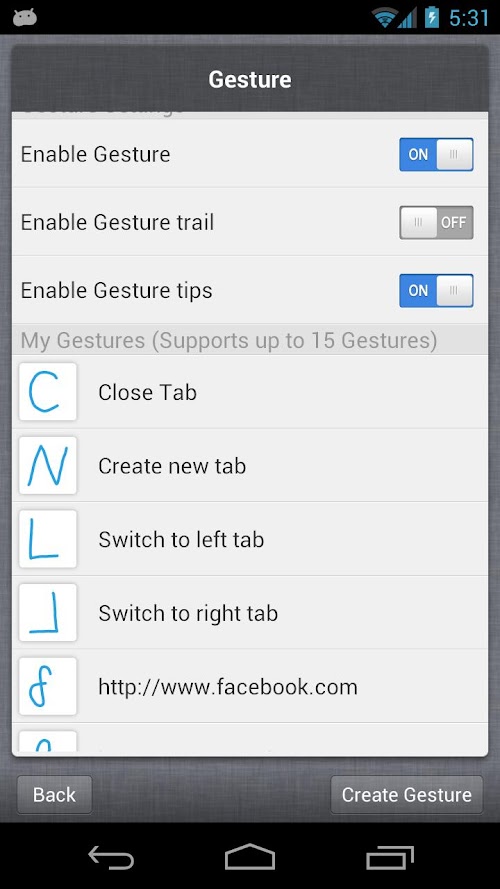 3. Support to create and edit gestures. You can have up to 15 customized gestures.