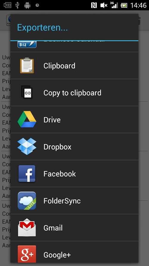 2. Vervolgens exporteer je de gevonden artikelen met behulp van de ingebouwde exporteer functie. Je kunt hiervoor kiezen uit email, Dropbox, Google Drive of jouw eigen favoriete app.