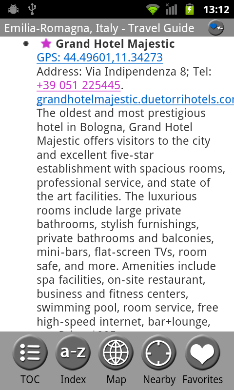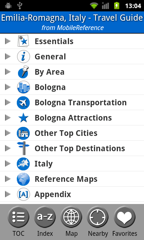 MobileReference Travel Guides provide detailed, practical information about attractions, landmarks, transportation, cultural venues, dining, lodging, history and much more. They are indexed alphabetically and by category, making it easier to access individual articles. Attractions can be viewed on an offline GPS map along with your current location so that you can easily find attractions near you as you explore the city.